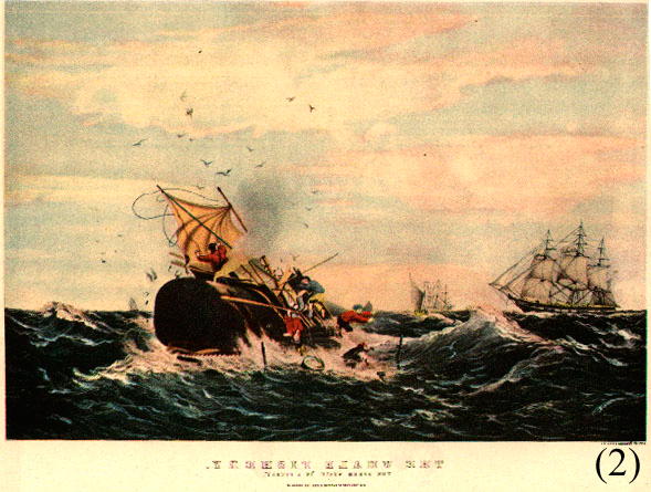 (2) Cacería de un cachalote, ilustración de Currier & Ives, ca. 1850.