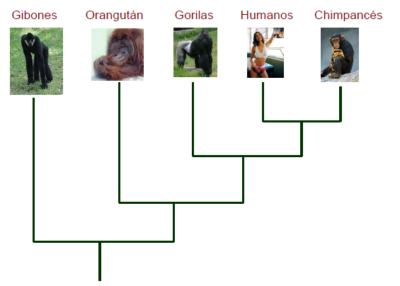 Abajo se presentan las relaciones de parentesco evolutivo entre los simios actuales (los gibones, orangutanes, gorilas, seres humanos y chimpancés). El esquema está muy simplificado pues no muestra los cientos de formas extintas que han existido. Según la evidencia más recientes, las dos especies de chimpancé representan el grupo hermano de los seres humanos, pues comparten un ancestro común con nosotros. El grupo humanos + chimpancés a su vez comparte un ancestro común con los gorilas y así sucesivamente. Como vemos, no hay una progresión lineal «de los monos al hombre» como la que aparecía en los textos antiguos. La evolución tampoco implica que los seres humanos hayan surgido a partir de una de las formas actuales de simios, como parece mostrar la ilustración del principio de esta nota.