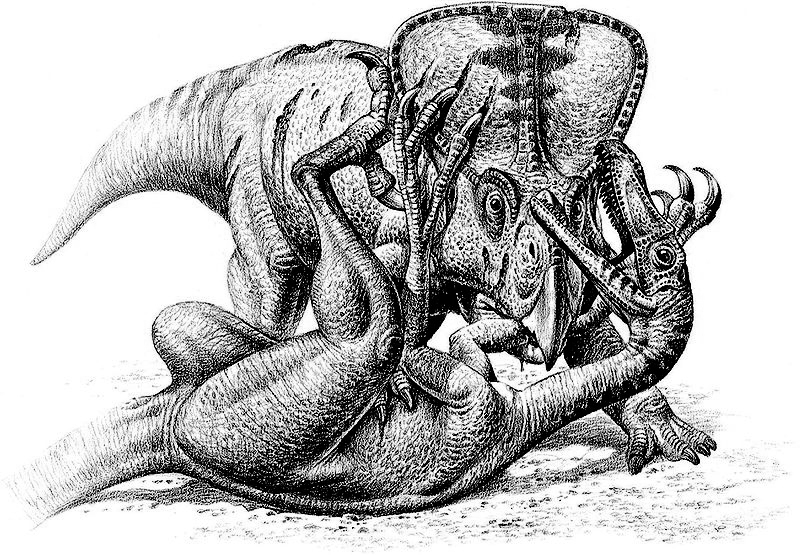 También a partir de los resultados de Schmitz y Motani podemos saber más sobre los dinosaurios trabados en lucha mortal. Los Protoceratops eran catemerales o crepusculares, mientras que los velocirraptores eran principalmente nocturnos. Entonces podemos deducir que la batalla final de los dos animales capturados en el material fósil de Djadochta ocurrió muy probablemente al atardecer o, con una probabilidad un poco menor, durante la noche. Echando a volar la imaginación, podemos visualizar a los dos dinosaurios trabados en una lucha ancestral, con sus siluetas dibujadas por los últimos rayos solares de un día normal de hace 80 millones de años. A la mitad de la tremenda batalla por la subsistencia, los dos animales se ven sorprendidos por la repentina caída de arena sobre sus cuerpos aún trabados en feroz lucha. Ese instante, esa estampa fugaz de la vida cretácica, quedó atrapado en el maravilloso fósil de Djadochta.